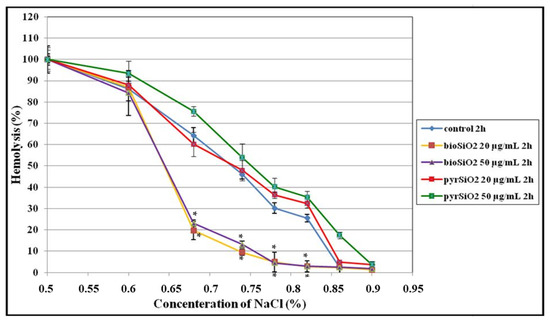 In another experiment, we tested the osmotic resistance of red blood cells modified by SiO2 nanoparticles (pyrogenic and biogenic). Based on the previous study, which was focused on hemolytic toxicity of nanoparticles, in this experiment, two non-lytic concentrations, namely 20 µg/mL and 50 µg/mL were used. Figure 11 presents the curves of osmotic resistance observed in erythrocytes which were modified by given nanoparticles. On the basis of the obtained data, one can identify this level of osmotic resistance in relation to the concentration of psychological saline (IC50) which is responsible for 50% hemolysis of erythrocytes which were modified by SiO2 nanoparticles (Table 1). The obtained results show that 50% hemolysis of erythrocytes treated with pyrSiO2 (50 µg/mL) nanoparticles is observed at the concentration of 0.72% NaCl (after 2 h of incubation). In relation to bioSiO2 (50 µg/mL), the results are as follows: 0.63% NaCl (after 2 h of incubation) and at the concentration of 0.65% (after 24 h of incubation).