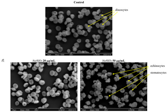 The impact of SiO2 nanoparticles on the shape of red blood cells was determined using a microscope. On the basis of the photographs taken, the changes caused by the presence of the analyzed compounds were investigated. The obtained results prove that SiO2 nanoparticles are responsible for changes in the shape of erythrocytes. Selected photographs, which were taken using a scanning electron microscope, are presented in Figure 12. As it is presented in relation to the control sample, a vast majority of cells were of regular shapes (discocytes). In the presence of pyrSiO2 nanoparticles in the concentration of 20 μg/mL (after 2 h of incubation), echinocytes were observed, but still, the predominant group was formed by discocytes. In case of the concentration of 50 μg/mL, much more echinocytes were observed. Moreover, it was also noticed that under the concentration of 50 μg/mL erythrocytes show a tendency to aggregate and to form clumps of cells. Both selected concentrations of mesoporous SiO2 nanoparticles induce the shape of echinocytes and stomatocytes.