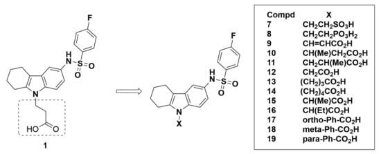 In 2005, after ramatroban was identified as a GPR44 antagonist, Robarge et al. at Athersys, Inc. synthesized several ramatroban analogues to elucidate pharmacophores with promising affinity for GPR44. The analogues were created by changing the substituents and/or the location of the substitution [56], in which the scaffold of benzenesulfonamide was inserted into the phenyl group instead of the cyclohexane in ramatroban (Figure 2).