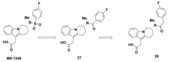 The replacement of the sulfonyl group of MK-7246 with a carbonyl group yielded compound 27. Further addition of a CH2 group between the carbonyl and phenyl group produced compound 28, which showed promising properties (Table 1). The binding affinity of compound 28 for GPR44 was desirably strong with a Ki of 7.4 nM and IC50 of 12 nM, characterized through a cAMP assay in HEK293 cells. Additional studies for GPR44-related eosinophil shape change confirmed strong affinity with an IC50 at 4.8 nM. The selectivity of the compound was found to be optimal with IC50 values for DP1 and TP above 1000 nM. The pharmacokinetic profile of compound 16 showed issues with bioavailability, however, possibly due to limited access into the liver. In rat, the bioavailability was only 14%, but the clearance, distribution, and half-life were comparable to MK-7246 (0.38 mL/min/kg, 0.13 L/kg, and 4.6 h, respectively). The compound was also predicted to have no issues with drug-drug interaction, as there was little selectivity for CYP (IC50 > 50,000 nM). The metabolism of compound 28 was low, with 91% concentration remaining after 1 h and 60% glucuronidated. The study identified no hydroxylated metabolites produced from the compound or amide hydrolysis. However, compound 27 showed a weak affinity for GPR44 (Figure 8). The Ki and IC50 elucidated through a cAMP assay both were unsuitably high at 340 nM and 2500 nM, respectively. As such, the poor affinity of this compound led to discontinuation of its testing.