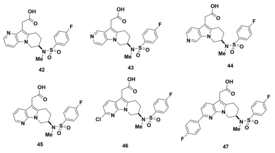 Addition of a methyl group resulted in two diastereomers, but only the R-isomer (compound 40) exhibited favorable affinity values (Figure 10). The Ki value was low at 4.0 nM, and the IC50 values, elucidated through eosinophil shape change and cAMP production, were 0.96 nM and 3.0 nM, respectively. The selectivity of compound 40 for GPR44 was also promising, in which the compound exhibited at least 500-fold selectivity for GPR44 over IP, EP1, EP2, EP3, EP4 and FP. In vivo studies on compound 40 found optimal pharmacokinetic properties. The bioavailability (F) of 73%, drug clearance (Cl) of 1.1 mL/min/kg, volume of distribution (Vd) of 0.36 L/kg, and half-life of 4.7 h were all optimal or acceptable. Compound 40 should also have little drug-drug interaction, as its affinity for CYP 3A4 and CYP 2C9 showed an IC50 greater than 50,000 nM. By comparison, the other isomer (compound 41) showed a higher Ki value of 39 nM and IC50 value of 30 nM from a cAMP assay.
