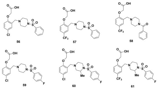 The halogen substitution on the distal aryl ring using 4-fluorophenyl resulted in compound 59 (Figure 13), which demonstrated a low IC50 value of 10 nM. An additional substitution with a methyl group on the piperazine ring (compound 60) further decreased the IC50 to a desirably low value of 1.0 nM (Figure 13). The para-position was found to be more potent and metabolically stable. Replacement of the chlorine in compound 60 with a CF3 (compound 61) maintained similar activity, with an IC50 value of 0.3 nM (Figure 13). While other compounds did not display agonist activity and behaved as antagonists, compound 61 showed partial agonist activity in the eosinophil shape change assay, with a DK-PGD2 efficacy of around 40%.