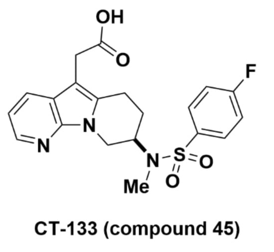 The R enantiomer of the reverse indole of TM-30089 was isolated from the racemic mixture and identified as MK-7246 by Gallant et al. from Merck in 2007 (Figure 6), which displayed a higher affinity for and selectivity toward GPR44 over TP than the S enantiomer [69]. Subsequent studies investigated the compound’s pharmacokinetic and metabolic profile. MK-7246 displayed a Ki value of 2.5 nM from GPR44 competition binding assays and strong binding affinity to GPR44 in recombinant mouse, rat, dog, cynomolgus monkey, and human with IC50 values of 9.2 nM, 4.6 nM, 6.3 nM, 6.9 nM, and 3.5 nM, respectively [70]. In addition to a favorable affinity for GPR44, MK-7246 displayed little off-target binding, with a 149-fold weaker affinity for the DP receptor and more than 1500-fold weaker affinity for other prostanoid receptors. MK-7246 also demonstrated antagonist potency in blocking DK-PGD2-induced inhibition of cAMP in recombinant cells overexpressing human GPR44 (IC50 = 3.0 nM), DK-PGD2-induced eosinophil shape change (IC50 = 2.2 nM), and DK-PGD2-induced CD11b expression on eosinophils and basophils (IC50 = 6.2 nM and 5.4 nM, respectively).