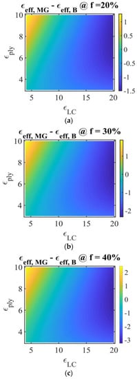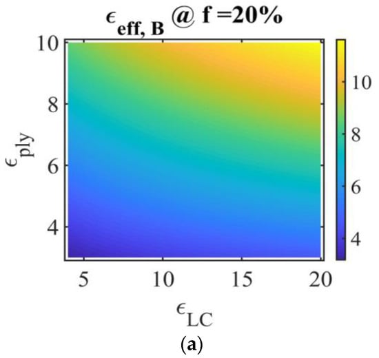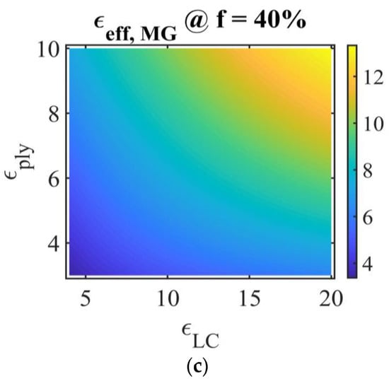 , obtained using the Maxwell Garnett model (Equation (10)), for LC volume fractions of 20%, 30%, and 40%, commonly used in the study of PDLC films and for whom LC forms individual droplets. The numerical values in the following discussions refer to the relative permittivity of the materials. The polymer permittivity variation domain is chosen between 3 and 10, and the LC permittivity between 4 and 20, considering their values at high frequency [