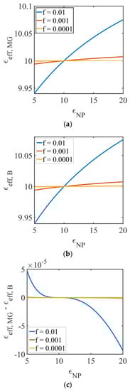 , for three NP volume fractions: 0.01; 0.001; and 0.0001, using the MG model (Equation (15),