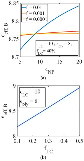 Figure 7a represents the effective permittivity for the NPs-doped PDLC (Equation (17)), versus