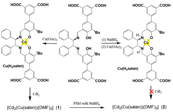 | [Cd2(Cu(salen))(DMF)3]·DMF·3H2O | Cd/Cu | 45, methanol | 70 | 31 |
