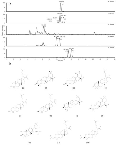 - Rhourri-Frih, B.; Chaimbault, P.; Claude, B.; Lamy, C.; André, P.; Lafosse, M. Analysis of pentacyclic triterpenes by LC-MS. A comparative study between APCI and APPI. J. Mass Spectrom. 2009, 44, 71–80. [Google Scholar] [CrossRef] [PubMed]