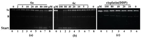 Gel electrophoresis mobility shift assay of pBR322 DNA treated with 6a, 6c and cisplatin. (a) Lane 0: DNA alone; lanes 1–7: DNA + 6a; lane 8: DNA+DMSO; (b) lane 0: DNA + DMSO; lanes 1–7: DNA + 6c; lane 8: DNA alone; (c) lane 0: DNA + DMSO; lanes 1–5: DNA + cisplatin; lane 6: DNA alone; R: linear from DNA, Sc: supercoiled DNA.