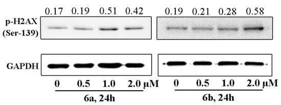 To further investigate whether 6a and 6c could lead to DNA damage, the comet assay was performed and the expression level of p-H2AX was examined by Western blots. Figure 3 showed that the treatment with 6a and 6c led to long DNA tails, implying that 6a and 6c could induce DNA damage [34]. In addition, the treatment of 6a and 6c resulted in the upregulation of p-H2AX expression level (Figure 4), a well-known marker for DNA double-strand breaks, further confirming the presence of DNA damage [32].