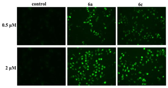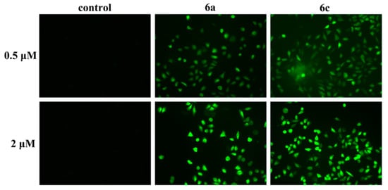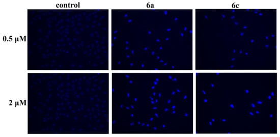 Since DNA damage can initiate an apoptosis response [1,2,3,4], the effect of 6a and 6c on apoptosis progression was examined. Acridine orange (AO) staining assay results (Figure 6) showed that the morphology of 6a- and 6c-treated T-24 cells exhibited clear changes and that cell nuclei were stained as yellow/orange, indicating chromatin condensation or breakage caused by apoptosis, and that 6a and 6c could induce apoptosis in T-24 cells. In addition, as Figure 7 shows, Hoechst 33258 staining of T-24 cells treated with 6a and 6c exhibited strong blue fluorescence and typical apoptotic morphologies at the concentrations 0.5 and 2 µM, respectively, while T-24 cells not treated with 6a and 6c displayed normal blue fluorescence, also confirming that 6a and 6c could indeed induce apoptosis in T-24 cells.