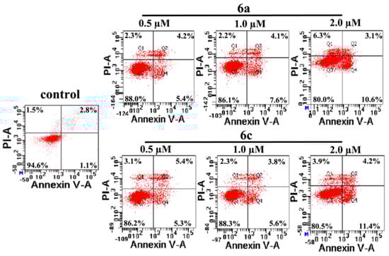 The apoptotic cell rates were then determined with the T-24 cells treated with 6a and 6c at the concentration of 0, 0.5, 1 and 2 for 24 h, respectively. The results (Figure 8) demonstrated that treatment of the T-24 cells with complexes 6a and 6c at different concentrations led to obvious increases of the apoptotic cell population (9.6%, 11.7%, 13.7% and 10.7%, 9.4%, 15.6%, respectively), in comparison with the control (3.9%), implying that 6a and 6c could induce the apoptosis of T-24 cells.