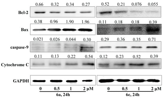 Western blot analysis of caspase-9, Bcl-2, Bax and cytochrome C after treatment of T-24 cells with 6a and 6c at concentrations of 0.5, 1 and 2 μM, respectively, for 24 h.