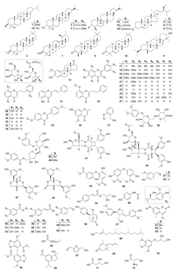 The detailed phytochemical and nutritional analyses of I. cylindrica had been carried out. Among the constituents isolated from I. cylindrica, saponins, glycosides, flavonoids, coumarins, and phenols are the primary types. All compounds are summarized and compiled in Table 1, and the structure of them has been detailed in Figure 1.