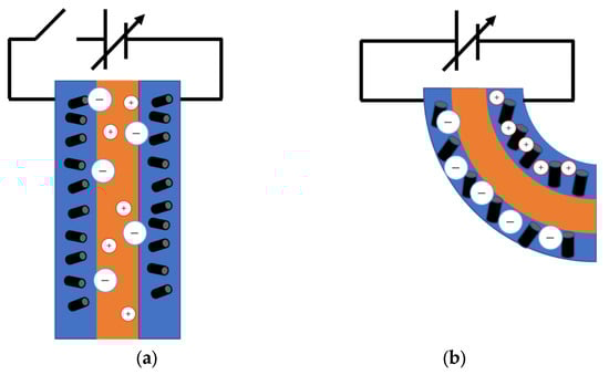 Ionic liquids are used, so the ions are spread over the entire device. When a voltage is applied to this device, ions move to each electrode layer. The sizes of the cations and anions are different [], so the electrode layer to which the large ions have moved expands, and the electrode layer to which the small ions have moved shrinks. As a result, the actuator is deformed.