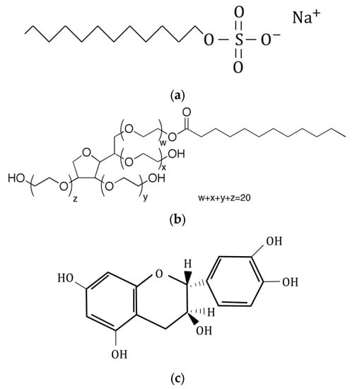 Structure of dispersants (a) SDS, (b) polysorbate 20, and (c) catechin.