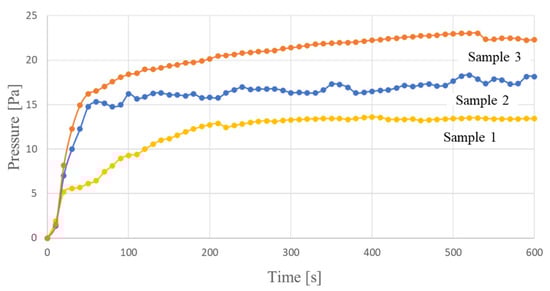 For the first test, we used an electronic scale to measure the pressure the device generated. The pressure with which the actuator pushes the scale was used as an index. We will explain the specific measurement method in Section 4.4. Figure 5 shows the measured generated pressure as a function of time. Here, we represent the results of a sample using 100 mg of catechin as a dispersant. The resistance of this sample was 12.2 Ω/sq.