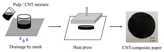 In this study, 30 mg of single-walled CNT (ZEONANO SG101, ZEON Corporation, Tokyo, Japan) with an average diameter of 3 to 5 nm and a length of 100 to 600 μm and 100 mg of pulp were used for one sheet of the CNT-composite paper. The prepared sample was a circle with a diameter of 6 cm. The procedure is shown schematically in Figure 10.