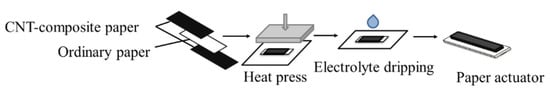 Devices called actuators convert input energy into physical motion. Many mechanical actuators can move with electric energy. Currently, metal actuators are mainstream. Recently, wearable devices have been attracting attention in areas such as the medical field. Wearable soft actuators require features that differ from those of conventional actuators, such as light weight and flexibility. CNTs are attracting attention as one potential material for these soft actuators. CNT-based soft actuators using heat [], light [], or ion bias [,,] have been reported, but are not yet commonly used. One of the reasons for this is that these devices’ movement is simpler than that of existing actuators. We hope to solve this problem with a paper actuator made of CNT-composite paper. Because it would be made of paper, complicated three-dimensional structures could be formed relatively easily, and movement with a high degree of freedom would be possible. For these reasons, we aim to develop a paper actuator using CNT-composite paper.
