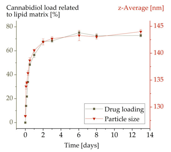 For MCT-P188-120 nm, the drug load increased over time up to a CBD content of 73% in relation to the lipid content. The maximum drug load was reached after approximately 5 days. Therefore, in order to ensure complete loading, a period of at least 7 days was specified for all other drug loading procedures. The observed loading capacity of 73% (related to the lipid) is remarkably high when compared to that for other drugs, which is mostly lower than 10%–20% [10,11,12]. By means of passive drug loading, a similarly high drug loading could previously only be achieved for propofol [11].
