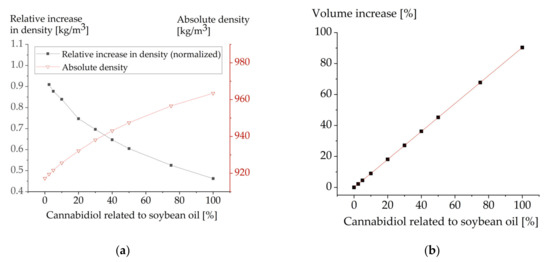 In the nominator, the difference of the density of soybean oil with the corresponding CBD content and that of the CBD-free soybean oil was calculated. Subsequently, to be able to compare the resulting values, they were normalized to the CBD content (x%). The percentage of CBD that was used in these calculations reflects the mass that was added to soybean oil. The composition at “100% CBD” was thus 100% soybean oil + 100% CBD (Figure 3).