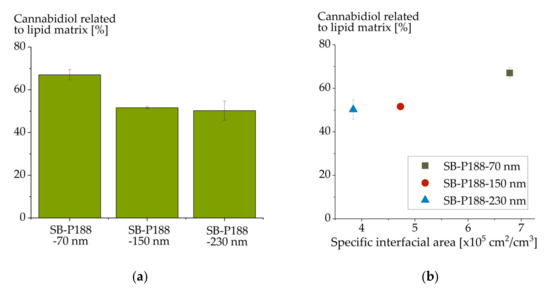 Cannabidiol load (mass percent) of differently sized colloidal soybean oil emulsions (a); (b) illustrates the drug load in dependence on specific interfacial area of the emulsion droplets.