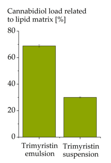The achievable drug load decreased substantially from 69% in the trimyristin emulsion to 30% in the corresponding suspension (Figure 5). This correlates well with previous observations, where for most substances a lower drug load was achieved in suspensions compared to emulsions [11,12,45]. This may be explained by the reduced space available for the drug in the crystalline lipid matrix compared to the liquid lipid of the emulsion particles. After incorporation into an emulsion, the drug may be displaced to the surface or into the aqueous phase upon crystallization of the droplets [46,47]. Furthermore, upon passive drug loading, the drug can be expected to mainly be loaded onto the droplet interface, because it may be difficult for the drug to intrude into the crystalline structure of the lipid matrix. For CBD, a remarkably high drug concentration of 30% could still be loaded to the trimyristin suspension particles. This confirms the assumption that CBD partly localizes in the interfacial area instead of a pure matrix localization. Nevertheless, the increased interfacial area of the suspension particles cannot compensate the limited space in the lipid matrix caused by its crystalline state.
