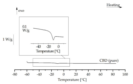 DSC analysis of the CBD-loaded trimyristin emulsion indicated a strong decrease in the crystallization temperature of the lipid. Thus, in addition to the behavior of mixtures of CBD and trimyristin bulk materials (see Supplementary Information), the thermal behavior of CBD was also analyzed. A strong supercooling tendency of pure CBD was detected. When melted CBD was cooled to −60 °C, it seemed to solidify in an amorphous state, because no crystallization event could be observed and a glass transition was detected between −20 and −10 °C upon a subsequent reheating to 85 °C (Figure 7). The strong supercooling tendency may provide the possibility to produce colloidal emulsions with pure CBD as dispersed phase. The production of stable emulsions from a drug in the supercooled state has already been described for ubidecarenone [49].