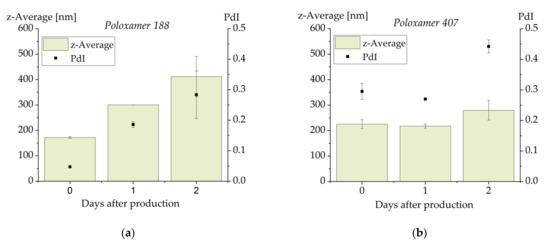 Particle size and PdI of emulsions containing pure cannabidiol as dispersed phase and stabilized with poloxamer 188 (a) or poloxamer 407 (b). The results represent the mean values of n = 2. The error bar shows the upper and lower measured values.