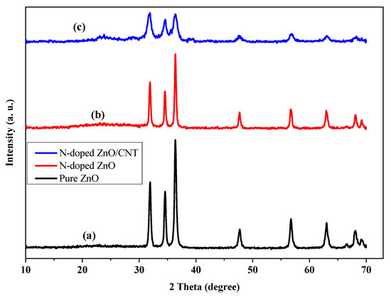 XRD patterns of (a) pure ZnO, (b) N-doped ZnO, and (c) N-doped ZnO/CNT thin film.