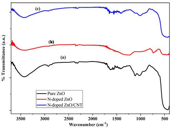FT-IR spectra of (a) pure ZnO; (b) N-doped ZnO; and (c) N-doped ZnO/CNT nanocomposite thin films.