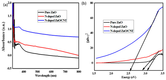 The photocatalytic activity of photocatalyst depends on the light absorption capacity. UV-visible absorption spectra have been measured to determine the optical properties of the prepared thin films and the obtained results are shown in Figure 4a. The pure ZnO has an absorption maximum at 362 nm, whereas the peaks at 368 nm and 366 nm are obtained for the N-doped ZnO/CNT and N-doped ZnO, respectively. The presence of absorption peak indicates the electronic transition from valence band to conduction band of ZnO nanoparticles [45]. It can be seen that N-doping has an influence on the absorption spectrum into UV to the visible region (red shift). The similar results are also found in the references for the redshift in the absorption edge [30]. The band gap of prepared thin films has been calculated with help of the following Tauc equation (Equation (8)):