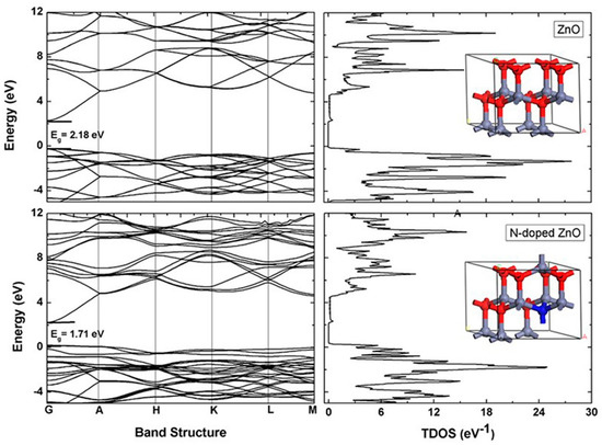 The lattice parameters of optimized Zn8O8 a = b = 3.127Å and c = 5.032 Å are in good agreement with experimental values (Table 2). After nitrogen doping, the lattice parameters of N-doped Zn8O8 (a = b = 3.124 Å and c = 5.098 Å) changes 0.003 Å and 0.066 Å for a and c, respectively. Theoretically calculated lattice parameters deviate 3.3% from those that are experimentally measured. To determine the effect of nitrogen doping in ZnO, band structure and total density of states (TDOS) of ZnO and N-doped ZnO have been calculated as shown in Figure 5. The band structure shows the band gap of ZnO is 2.18 eV, which is lower than that experimentally obtained. This deviation is originated because the DFT calculation is concerned with only the ground state [46]. After nitrogen doping, the band gap reduces to 1.71 eV, which is relevant for UV-visible absorption spectrum. To justify this, we calculated the total density of states (TDOS). The peak of the valence band maximum (VBM) of ZnO is located below the Fermi level. However, nitrogen doping in ZnO attributes the upward shift of VBM to reduce the band gap. There is almost no effect of nitrogen doping on conduction band minimum (CBM) of ZnO.