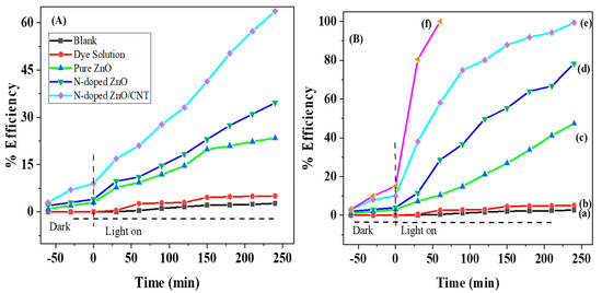 The photocatalytic performance of pure ZnO, N-doped ZnO, and N-doped ZnO/CNT thin films in degradation of MB dye was carried out under UV and visible light irradiation and results are shown in Figure 6. To confirm the photolysis and adsorption onto thin film, the adsorption as well as photodegradation experiments were conducted separately under visible light and UV light irradiation for 4 h. For both studies, no appreciable changes were observed due to adsorption and self photodegradation of the MB dye. About 100% of MB is degraded by an N-doped ZnO/CNT nanocomposite thin film photocatalyst within 4 h under UV light irradiation, while the efficiency is 63.69% under visible light irradiation. From Figure 6, it was noticed that about 60% of MB was removed after 60 min by UV light irradiation for N-doped ZnO/CNT, whereas only 16.66% and 28.57% for pure ZnO and N-doped ZnO photocatalysts. In case of visible light irradiation, the effectiveness of pure ZnO has 23.41% degradation efficiency, much less compared with N-doped ZnO (34.62%) and N-doped ZnO/CNT (63.69%). These results clarify that N doping enhances the photocatalytic efficiency of plain ZnO by reducing the band gap. On the other hand, CNTs improved the interfacial electron transfer rate and lessened the recombination possibility between photo-induced electron hole pair (e−/h+) more effectively than the ZnO photocatalyst alone. It could be summarized that the reduction of e−/h+ recombination and generation of more •OH radicals in the N doped ZnO as well as N-doped ZnO/CNT samples play a vital role in the improved rate of photocatalytic degradation. The produced •OH radicals have strong enough reactivity to break different (C-C, C=C, and C=O) bonds in MB molecules lead to the formation of CO2 and H2O at the end. However, many researchers have used numerous pollutants such as 4-cholorophenol, antibiotics, and natural organic matters, in order to examine the feasibility of the photocatalyst [2,47,48].