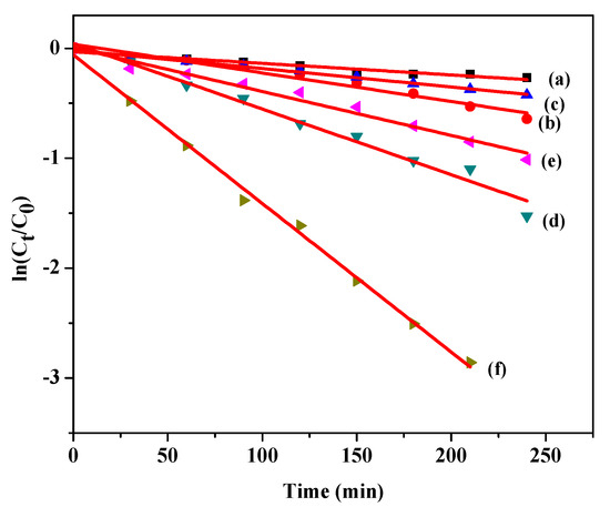 where r is the rate of reaction, k is the reaction rate constant (mgL−1 min−1), K is the observed equilibrium constant of the reactant (Lmg−1), and [MB] is the reactant concentration (mg L−1). When [MB] is very small, K[MB] is negligible with respect to unity and photocatalysis can be simplified to an apparent pseudo-first-order kinetics [51]. Therefore,