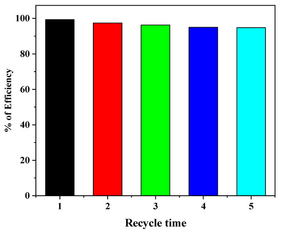 The long-term stability and recyclability of photocatalyst thin film are very crucial for MB dye degradation as well as large scale practical utilization in the industry. Therefore, the reusability of a prepared N-doped ZnO/CNT nanocomposite thin film was examined by five consecutive cycles for the degradation of MB dye under UV light illumination, and results are shown in Figure 8. After every test, the thin film composite photocatalyst was washed with distilled water and dried naturally at room temperature followed by the heat treatment at 500 °C for 1 h. After that, a thin film was applied for a second cycle MB dye degradation test like the first cycle experiment. The degradation efficiency of MB dye was reduced to about 5% after five successive cycles, which means that degradation efficiency reached 95% from 100% after five recycling times. These results definitely indicate that the fabricated N-doped ZnO/CNT nanocomposite thin film photocatalyst is highly stable and reusable. Furthermore, a comparison of the photocatalytic activity of the N-doped ZnO/CNT thin film photocatalyst with previously reported photocatalysts was listed in Table 4. From the Table 4, it is clear that degradation efficiency and reusability of N-doped ZnO/CNT nanocomposites are comparable to the results with earlier reported ZnO-based materials.