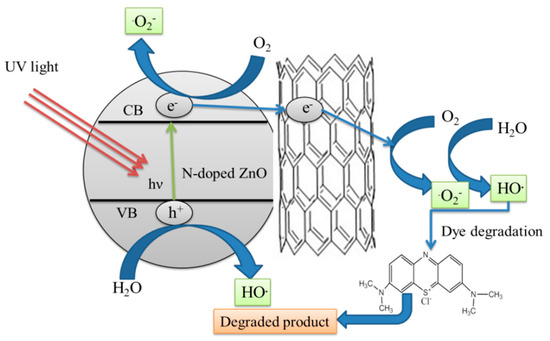 - N-doped ZnO/CNT composite + hv→ hvb+ + ecb−(CNT)