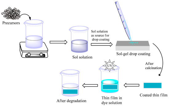 N-doped ZnO/CNT thin film was fabricated by applying sol-gel drop coating protocol according to the literature with some modifications [57]. Typically, to prepare the N-doped ZnO/CNT, 0.7316 g of zinc acetate dihydrate and 0.4 mL of tri-ethylamine were first dissolved in 9.6 mL of anhydrous ethanol under stirring environment (300 rpm) for 4–5 min, followed by the addition of 5wt% of nitrogen (urea) (28 mg urea) and 5wt% of CNTs (5 mg) to the above solution. The resultant solution was sonicated (Powersonic 405, Hwashin Technology Co., Seoul, Korea) for 1 h to obtain a uniform dispersion. Then, the solution was preserved for 1 h maintaining temperature (55 ± 5) °C with continuous stirring at 300 rpm until a quite stable and transparent sol was obtained. Prior to the coating process, the stable N-doped ZnO/CNT sol was aged for 24 h and a commercial bench grinder (model: ST-150) was used to abrade glass slide having dimension of 10 mm × 60 mm × 1.5 mm. The abrasive glass slide was cleaned by using potassium dichromate and dichloromethane solution, respectively, followed by washing with alcohol and distilled water and then dried at 100 °C in an oven for further use. The N-doped ZnO/CNT nanocomposite thin film (heterostructure) was fabricated by a sol-gel drop coating technique, as follows: first, the 0.4 mL sol was used drop-wise on a rubbed glass substrate using a pipette. Subsequently, the sol supported on substrate was warmed for 20 min in an oven at 80 °C to eliminate the loosely bonded particles from the glass surface. Coated thin film could cover approximately 2 µm on the above estimated area of abrasive glass substrate. To obtain the thick film (~4 µm), the coating was repeated twice as well as calcined using a muffle furnace (JSMF-30T, Gongju, Korea) retaining temperature 500 °C for 2 h. Similarly, the N-doped ZnO thin film was prepared in the absence of CNT. Finally, pure ZnO thin film was prepared using the same procedure. A schematic flow diagram for the fabrication of N-doped ZnO/CNT nanocomposite thin film by sol-gel drop coating method is shown in Figure 10.