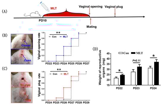 Melatonin administration during juvenile stage accelerated the onset of puberty. (A) The diagram of experimental design. (B) The effect of melatonin on vaginal opening: the representative photographs of vaginal opening and the statistic chart of vaginal opening. Con: n = 25; MLT: n = 25. df = 48; t = 3.113. (C) The effect of melatonin on mating date: the representative photographs of mating plug and the statistic chart of mating date. Con: n = 25; MLT: n = 25. df = 48; t = 3.246. (D) The effect of melatonin on reproductive weight. PD22 (Con: n = 19; MLT: n = 19. df = 36; t = 2.413.), PD23 (Con: n = 18; MLT: n = 17. df = 33; t = 1.627.), PD24 (Con: n = 20; MLT: n = 19. df = 37; t = 2.176.). Data were showed as “mean ± SEM”. * represent significant differences, p < 0.05; ** represent significant differences, p < 0.01.