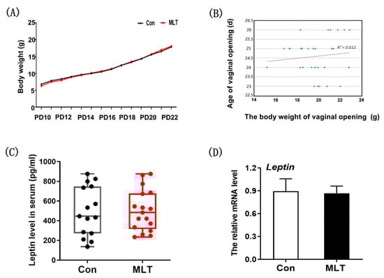 Melatonin did not accelerate the onset of puberty by physical development and Leptin level. (A) The effect of melatonin on growth curve of mice. Con: n = 4; MLT: n = 4. (B) The correlation analysis between body weight and vaginal opening. n = 30. (C) The effect of melatonin on Leptin level in serum. Con: n = 15; MLT: n = 17. df = 30; t = 0.047. (D) The effect of melatonin on Leptin level in adipose tissue. Con: n = 10; MLT: n = 10. df = 18; t = 0.446. qRT-PCR was independently repeated at least three times. Data were showed as “mean ± SEM”.
