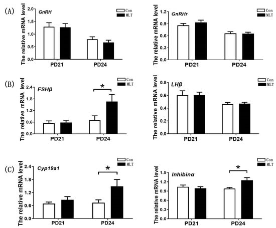 Melatonin accelerated the onset of puberty by enhancing the secretion of FSH and estrogen. (A–C) The effect of melatonin on the expression of genes in hypothalamus-pituitary-ovarian axis. Con: n = 7; MLT: n = 7. Fshβ: df = 12; t = 2.249(PD24). Cyp19a1: df = 12; t = 2.201(PD24). Inhibinα: df = 12; t = 2.827(PD24). The sample size of hormones assay was 21 and 24 in each group; qRT-PCR was independently repeated at least three times. Data were showed as “mean ± SEM”. * represent significant differences, p < 0.05.