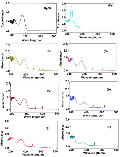 Electronic absorption spectra for H2mel, Gly and their metal complexes. Where, (A) = Mn(II) complex, (B) = Co(II) complex, (C) = Ni(II) complex, (D) = Cu(II) complex, (E) = Zn(II) complex and (F) = Zr(IV) complex.