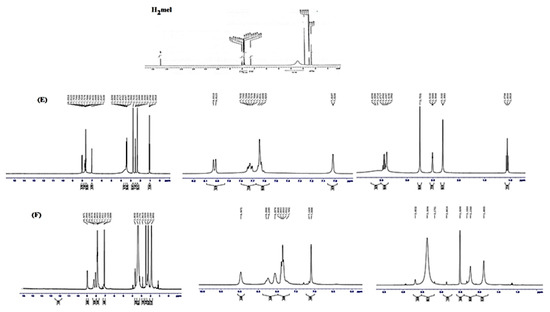 1H NMR-DMSO-d6 spectra for H2mel, (E) and (F) compounds. where (E) = Zn(II) complex and (F) = Zr(IV) complex.