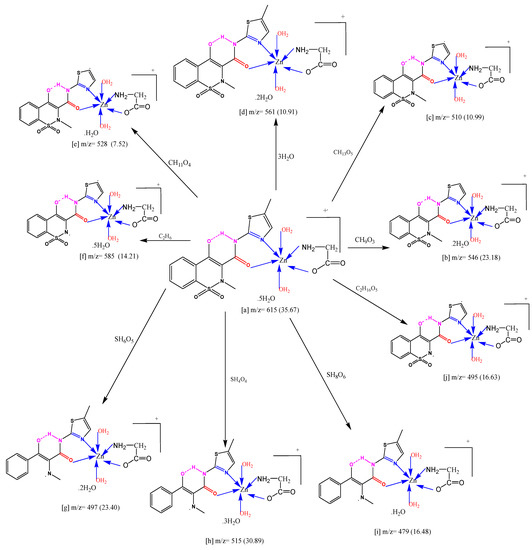 The mass spectra of complexes confirmed the molecular formulae reported. Mass spectra of all prepared compounds (Supplementary Figure S2) showed that the highest mass peak m/z = amu at 605 (19.43%), 555 (15.41%), 537 (21.54%), 560 (14.56%), 615 (35.67) and 603 (9.35%), respectively. These data agree very well with the formulae weight of the complexes. Scheme 3 showed the fragmentation pattern of (E) complex as representative example. Where the molecular ion peak [a] at m/z = 615 (35.67%) assigned to loss CH9O3 to give [b] at m/z = 546 (23.18%) and loss CH13O5 to give [c] at m/z = 510 (10.99%). The molecular ion peak [a] loses 3H2O to give [d] at m/z = 561 (10.91%) and loses CH11O4 to give [e] at m/z = 528 (7.52%). The molecular ion peak [a] loses C2H6 to give fragment [f] at m/z = 585 (14.21%) and loses SH6O5 to give fragment [g] at m/z = 497 (23.40%). The molecular ion peak [a] loses SH4O4 to give fragment [h] at m/z = 515 (30.89%) and loses SH8O6 to give fragment [i] at m/z = 479 (16.48%). Additionally, (E) complex loses the fragment C2H16O5 to give [j] at m/z = 495 (16.63).