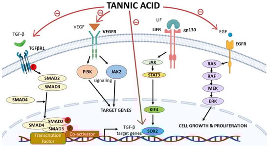 Tannic acid (TA) acts as a repressor for multiple proteins essential in several oncological signaling pathways. TA inhibits SMAD-dependent gene transcription in response to TGF-β, therefore inhibiting the transcription of TGF-β target genes. TA also inhibits VEGF/VEGFR, inhibiting a major angiogenesis signaling pathway in cancer. Moreover, TA inhibits the expression of SOX2 gene and inhibits EGF/EGFR signaling pathway and consequently cell growth and proliferation.