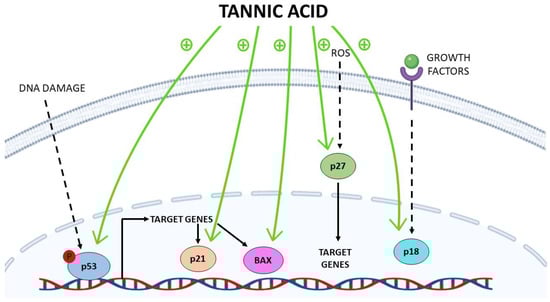 Induction of tumor suppressor proteins by tannic acid (TA). TA enhances the phosphorylation of p53, thereby increasing the expression of its target genes such as p21 and BAX. Moreover, on another level, TA could stimulate both p21 and BAX gene expression directly. TA also stimulates the gene expression of p27 and p18.