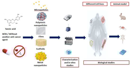 Tannins are phenolic compounds resulting from the secondary metabolism in several plants of high economic and ecological values. Tannic acid (TA) is a hydrolysable tannin present in several natural sources such as grapes, green tea, coffee, and others [9]. Concerning the physiochemical properties of TA, its molecular weight is 1701.2 g/mol with weak acidic properties and a strong astringent taste. TA exhibits a myriad of medicinal benefits such as anticancer, antioxidant, anti-inflammatory and neuro-protective effects [10]. In contrast, TA can interact with biopolymers and macromolecules by cross-linking due to its hydroxy and carboxy groups [11], posing it as a promising pharmaceutical candidate. This review focuses on TA potential as an anticancer agent and its possible incorporation in several drug delivery systems to improve its delivery, efficacy and clinical application.