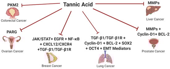 Schematic Representation of Tannic acid potential anticancer activity against several solid malignancies. This figure represents a summary of the potential role of Tannic acid (TA) as an anticancer agent through repressing several oncogenic signaling pathways and tumor-promoting factors in different solid malignancies such as colorectal, ovarian, breast, lung, prostate and liver cancers.