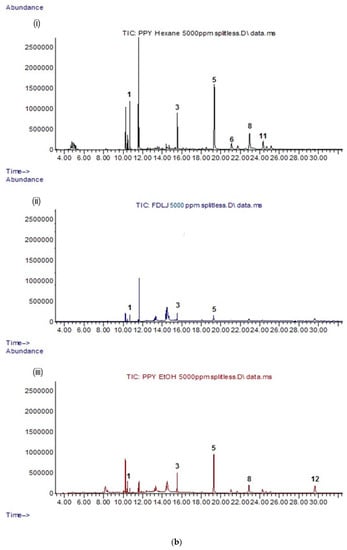 (a) Total ion chromatograms (TIC) of (i) CPSC extract; (ii) CPSCE extract at a fixed concentration of 5 mg/mL. The identified compounds (1–11) are listed in Table 1. (b) TIC chromatograms of conventional solvent extracts: (i) CPHE extract; (ii) CPFD extract; (iii) CPEE extract at a fixed concentration of 5 mg/mL. The identified compounds (1–12) are listed in Table 1. CPHE: Carica papaya leaf hexane extract; CPFD: C. papaya leaf juice freeze-dried extract; CPEE: C. papaya leaf ethanol extract; CPSC: C. papaya leaf scCO2 extract; CPSCE: C. papaya leaf scCO2 extract with 5% ethanol.