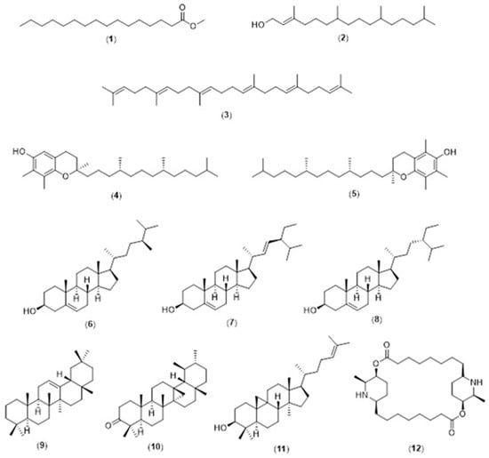 Chemical structures of identified lipophilic compounds (1–12) in Carica papaya (CP) extracts. The identified compounds are listed in Table 1.